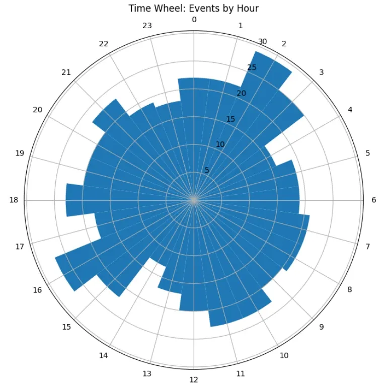 A Time Wheel (also known as a circular time or polar plot) visualizes temporal patterns over a 24-hour cycle. It’s useful for spotting hourly trends-like activity peaks throughout the day-by arranging data around a circle.